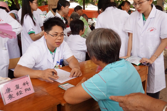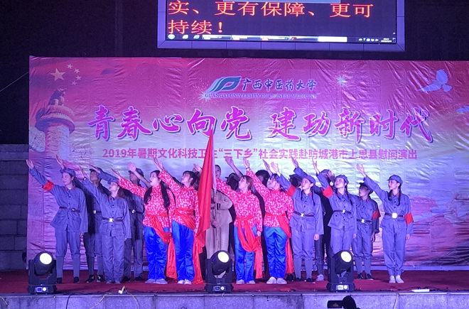 2019年7月15日,鸭脖由团学联一行人至防城港思阳镇开展以“青春心向党,建功新时代”为主题的暑期文化科技卫生“三下乡”社会实践活动。本次活动随行的有肖廷刚教授,冼寒梅教授等来自中医一附院、国际壮医医院的7名专家,由校团委副书记(主持工作)杨删带队。