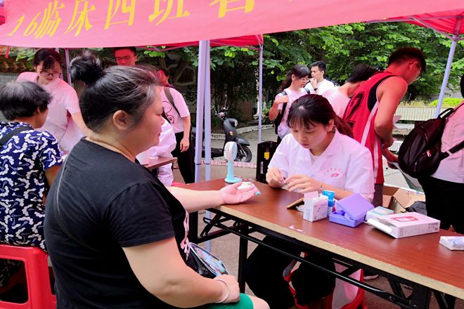 2019年07月13日上午,瑞康临床医学院2016级临床医学四班糖尿病宣讲团于南宁市西乡塘区明秀小区北区开展了“社区中老年居民糖尿病防治的知识宣讲”暑期社会实践活动,黄日丹老师和廖中杰师兄参加本次活动并进行指导。