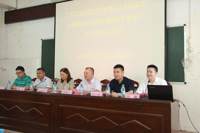 7月17日下午,鸭脖联合上海中医药大学、福建中医药大学与百色市委党校“岐黄育人实践基地”挂牌仪式暨2019暑期“健康扶贫青春行”社会实践启动仪式在广西壮族自治区百色市田东县委党校举行。上海中医药大学党委副书记、副校长朱惠蓉,上海中医药大学团委副书记(主持工作)吴平,上海中医药大学团委副书记万婕,福建中医药大学团委书记刘少渝,中共百色市委党校常务副校长李树立,广西田东县委党校副校长黄俊,YABO鸭脖团委副书记(主持工作)杨删,YABO鸭脖团委办公室主任陈晓东,上海中医药大学、福建中医药大学、YABO鸭脖大学生骨干共22人参加本次启动仪式。