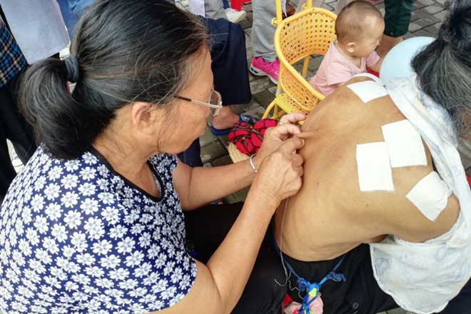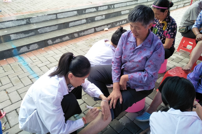本次活动小分队特邀到巴马民族医院两名壮医科医生来到现场义诊,本次义诊的主要服务对象为巴马易地搬迁贫困户。在义诊活动过程中,小分队成员为社区居民免费提供量血压、手法按摩、拔罐、艾灸、针灸、送凉茶等服务,还热心地给当地搬迁地居民科普相关健康知识。此外,小分队还设置了儿童游戏项目,与当地儿童玩游戏,并赠送玩具气球。为深入了解搬迁贫困户易地后的医疗现状以及居民的健康意识,我们通过现场问答的方式,了解搬迁户的真实情况。异地搬迁户作为城区的新群体,需要的是更多的关注与帮助。作为医学生,利用所学知识回馈社会,为需要帮助的人提供耐心、细致的服务和真心关爱是当代大学生义不容辞的责任。