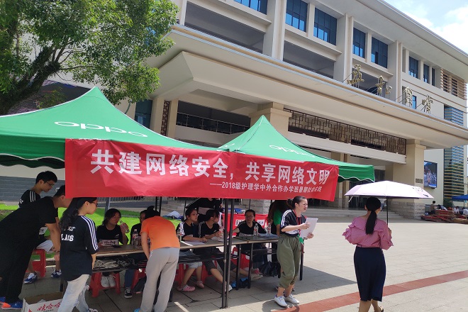 2019年6月30日2018级护理学(中外合作办学班)全体同学分成两组,每组十人,分别在YABO鸭脖仙葫校区五合食堂门口、广西外国语学院校园内以摆摊或调查问卷的形式完成了此次以“共建网络安全,共享网络安全”为主题的暑期社会实践活动。