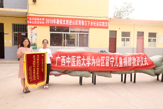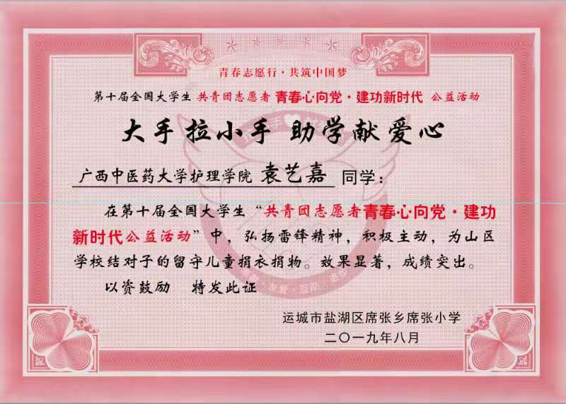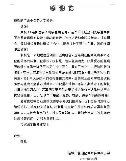 2019年8月,鸭脖收到一封来自运城市盐湖区席张乡席张小学对鸭脖18级护理学3班学生袁艺嘉参加“第十届全国大学生共青团志愿者 青春心向党,建功新时代 ”公益活动的感谢信,和两面感谢鸭脖团委、鸭脖青年志愿者协会“爱心服务进山区”“关爱留守儿童”的锦旗。