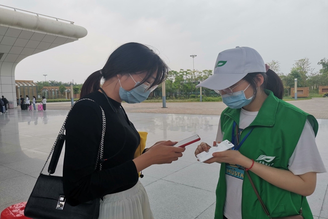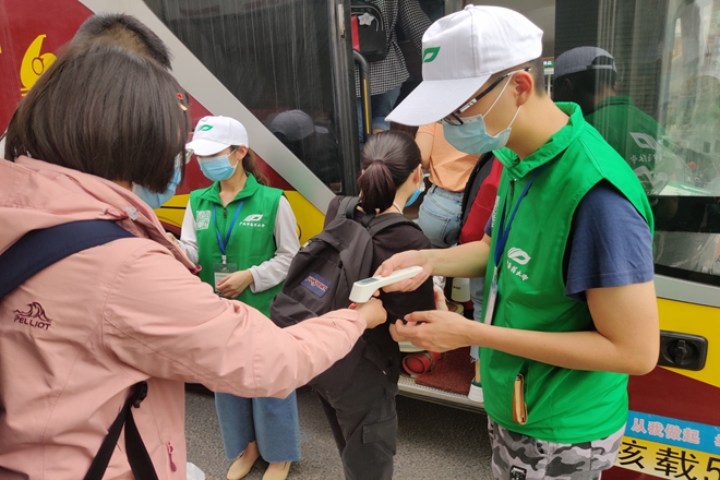 4月21号早上七点,志愿者们整装待发,到达站点后立即紧锣密鼓地工作。他们身穿绿色小马甲,头戴白色帽子,来回奔波于各接站口和上车点。在现场,志愿者们对到站的同学进行身份信息核查、健康核验、基础消毒、体温检测、乘车登记等工作。虽然站点人流量大,天气比较炎热,但志愿者们工作却没有丝毫松懈和抱怨。每个志愿者都坚守在自己的岗位上,工作进行得有条不紊。一直持续到晚上将近11点,才圆满结束当天的站任务。