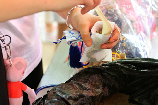 此次活动分为两个部分。第一部分为壮瑶药协会成员和志愿者于昆弟廊道向同学们展示如何制作香囊、如何选取菖蒲艾叶和点雄黄酒,并指导同学们亲手制作香囊和包捆菖蒲艾叶,同学们十分踊跃的参加到活动中。此外,壮瑶药协会成员还通过讲解的方式,向同学们讲解了香囊的药材成分及其功效作用。在领取完香囊后,同学们还在协会的宣传横幅上签下了自己的名字。