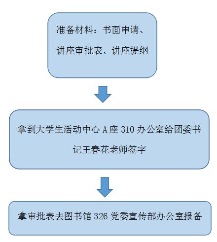 讲座审批【流程】 发布时间:2016-10-27 15:31:15 浏览次数: 次 【字体:小 大】 1.填写好讲座审批表。 2.拿讲座申请材料到大学生活动中心A座310办公室找团委书记王春花老师签字。 3.拿审批表去图书馆326党委宣传部办公室报备。 注: 1.讲座审批同时附书面申请、讲座提纲,讲座审批只同意讲座开展,如果要申请场地请另行申请。 2.值班时间:上午9:00-12:00,下午15:00-17:00,请同学们在上班时间前往申请。 3.请提前2-3天申请,以防出现特殊情况。 附件:讲座审批表 附件:书面申请 分享到: 【打印正文】