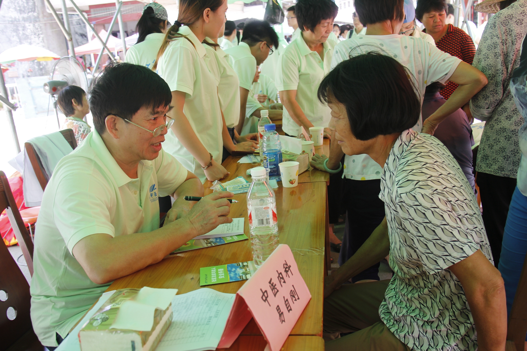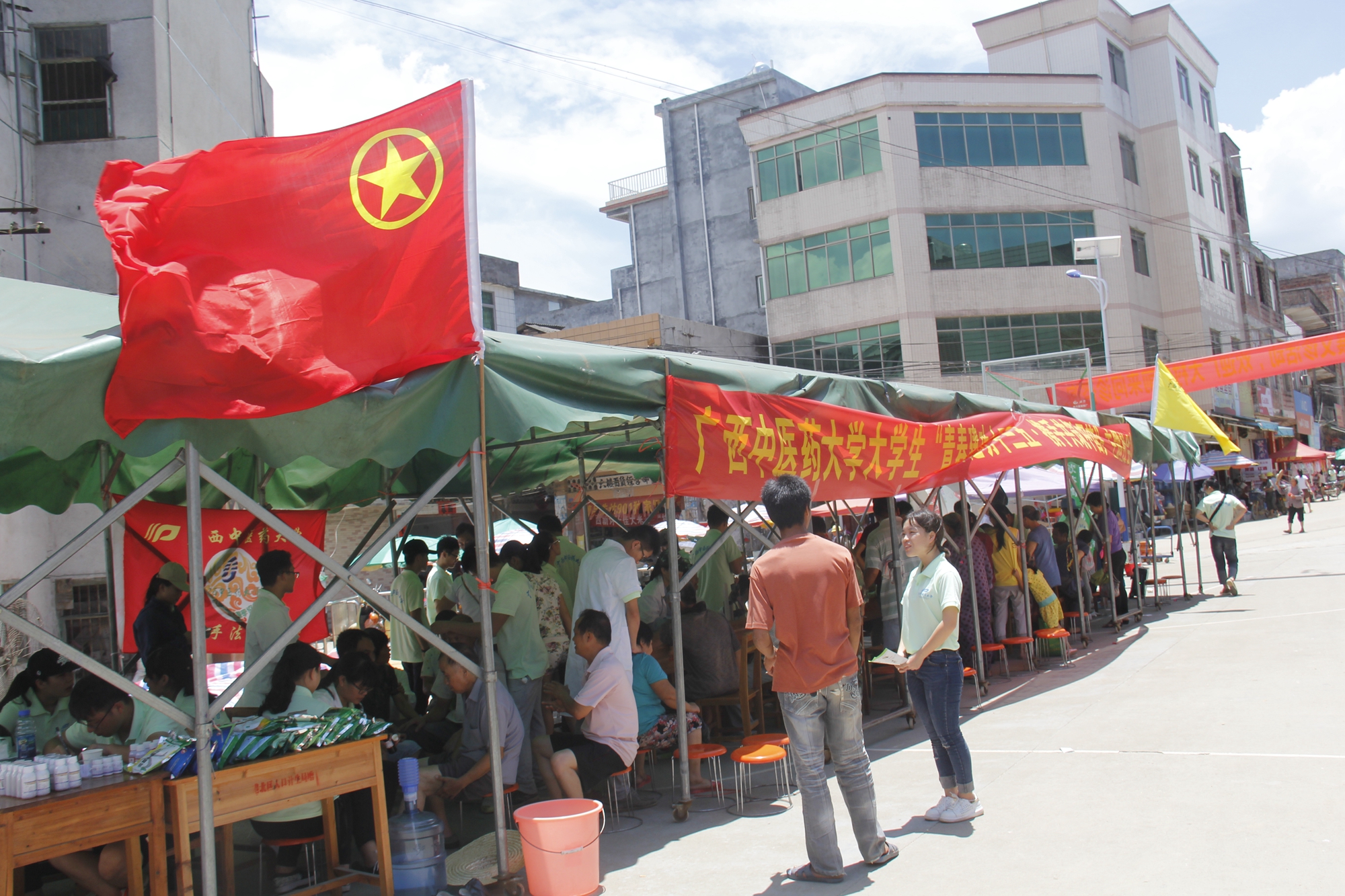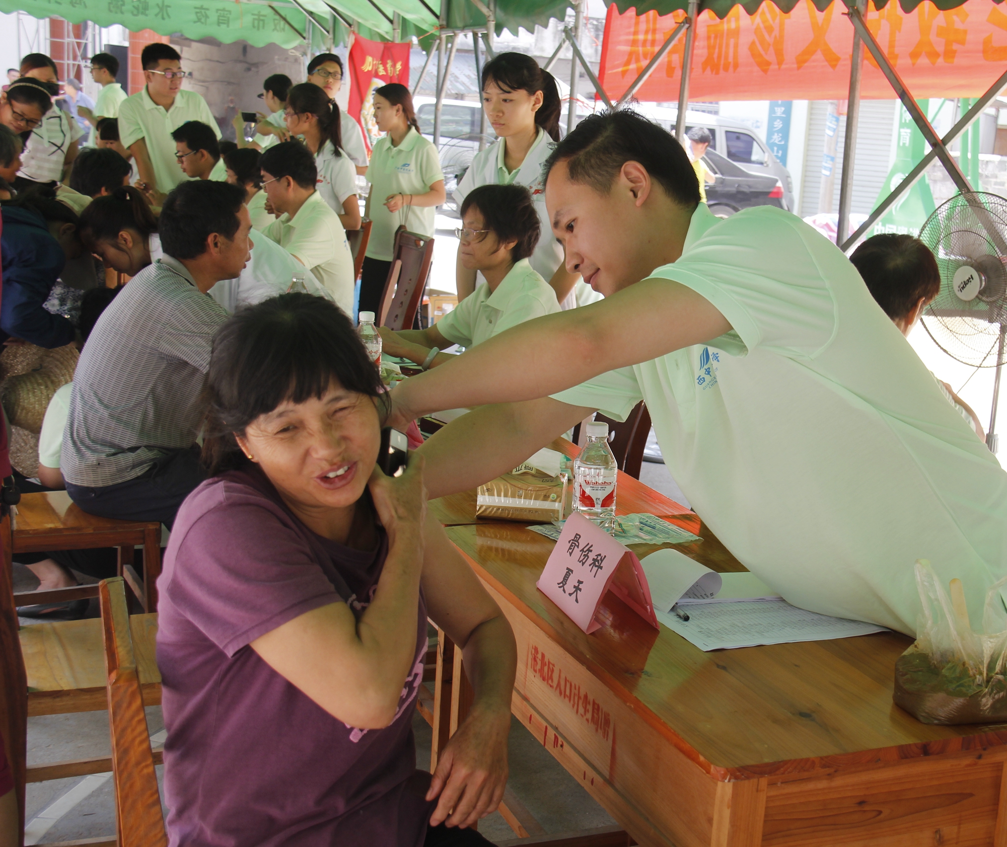 7月22日上午,到达中里乡龙山圩后,志愿者们便如火如荼地进行爱心义诊的准备工作。本次义诊以壮医药线陈雪斌教授、中医内科易自刚教授、针灸科梁立安教授、中医内科冼寒梅教授、中医妇科周卓秀教授、骨科夏天医师、针灸推拿科研究生王雄将等七位专家为居民们义诊,志愿者为乡民们普及急救知识、量血压和推拿按摩,形成“老专家老教授”+“大学生志愿者”的服务模式,老专家老教授保证了义诊服务的质量和群众信任度,大学生志愿者承担了大部分的接诊、量血压、针灸推拿等工作,在实践中得到了老专家老教授的指导,服务奉献同时增长了才干。正值大暑节气,老专家和志愿者顶着40度的高温,在圩镇上为全来求诊的乡亲们量血压、针灸推拿、诊脉开方、解决病痛,专家和志愿者尽管已经满头大汗,但仍然笑脸相迎,耐心地为前来就诊的乡民们解答疑难。前来求诊的群众络绎不绝,多次推迟收队时间,义诊时间从上午十点持续到下午4点,直到把最后一位看诊的乡亲看诊结束。