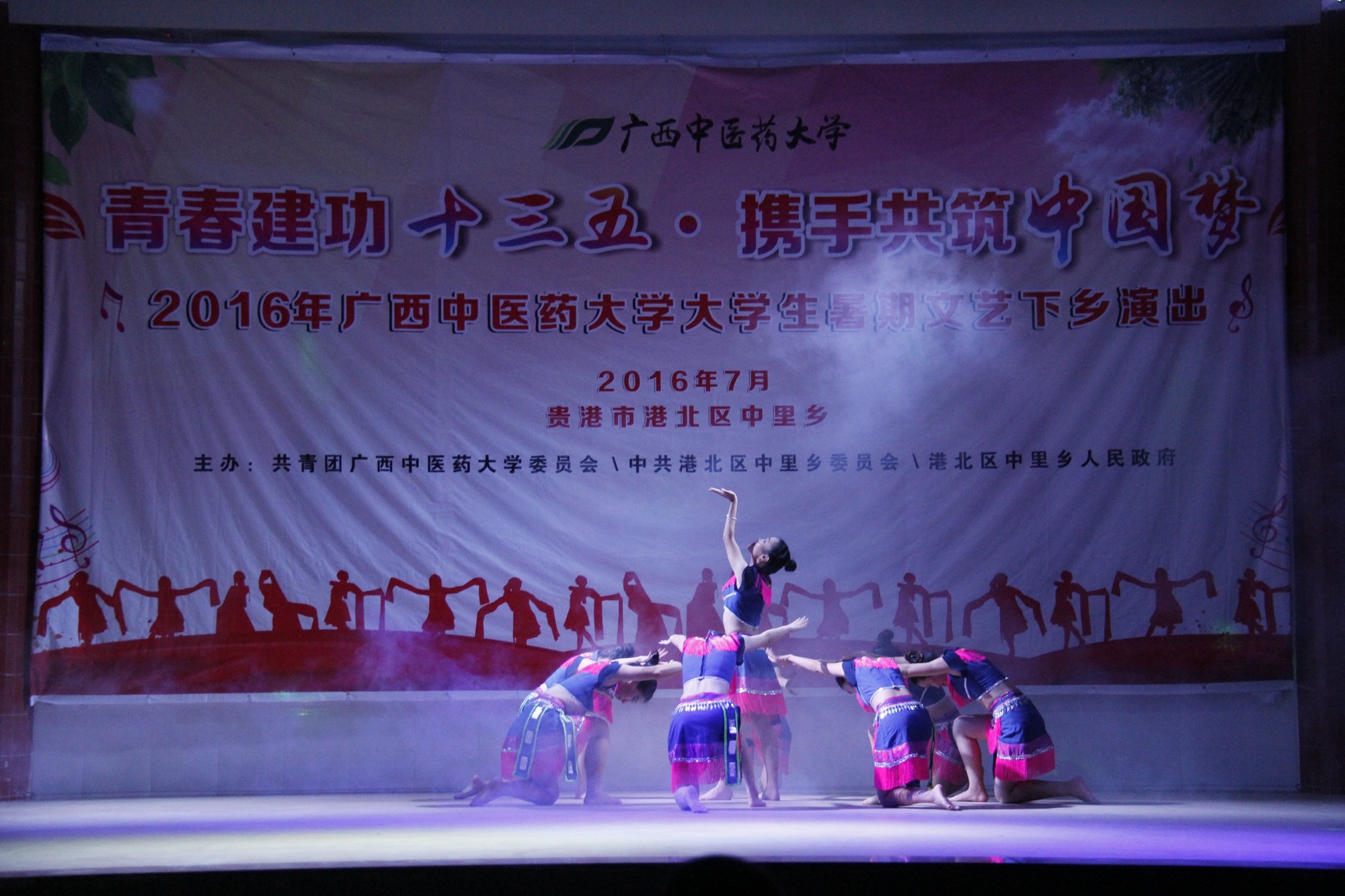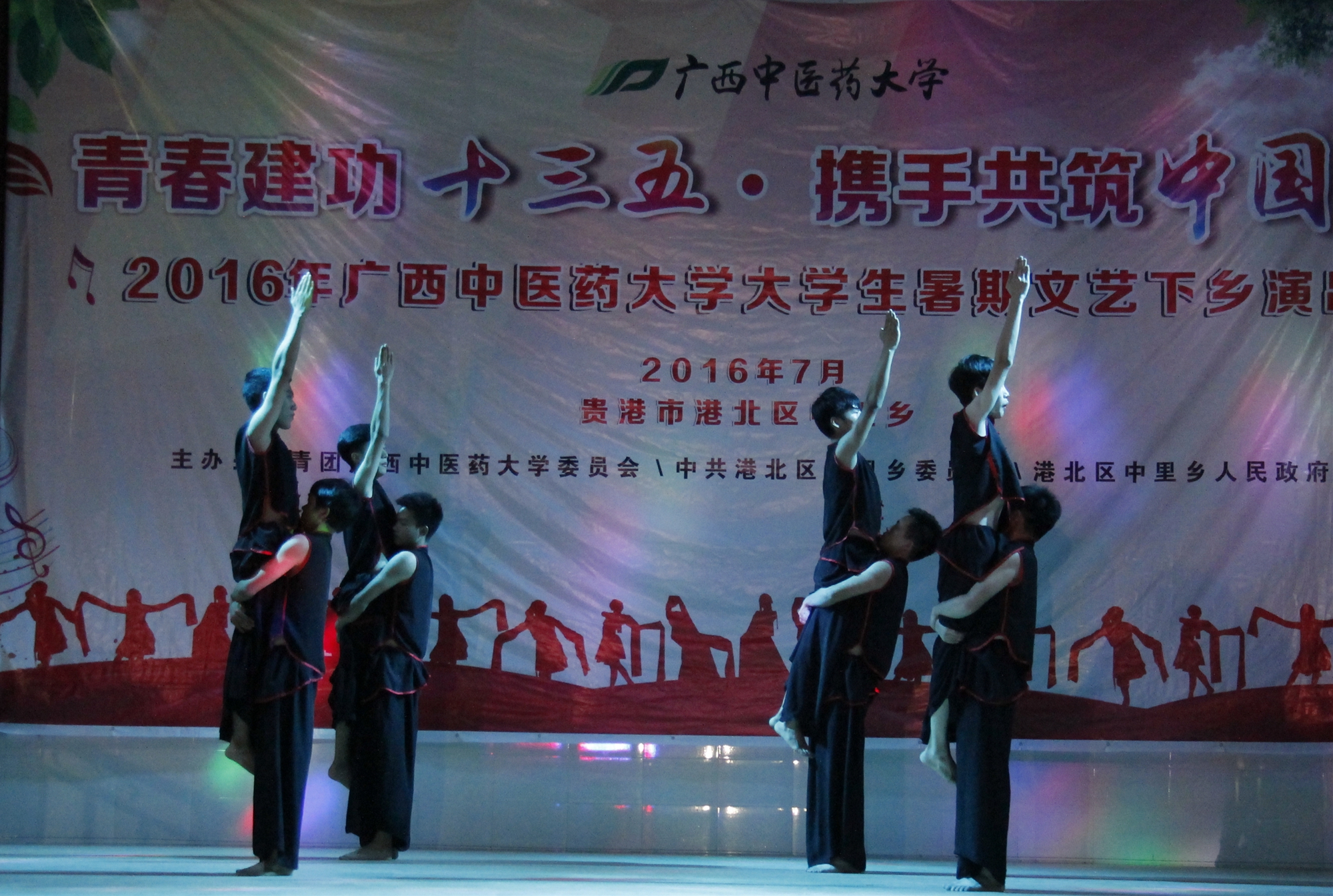 晚上,龙山圩的中心舞台被从十里八乡赶来的乡亲们围得水泄不通,以“青春建功十三五·携手共筑中国梦”为主题的宣传社会主义核心价值观和精准扶贫文艺演出如期开展,大学生志愿者与龙山文艺队的队员一起为当地群众献上一台主题鲜明、内容积极、精彩纷呈的文艺演出。由志愿者带来的开场舞《Bang Bang Bang》用热情和青春洋溢的气息为本次文艺演出拉开了帷幕,点燃了全场的气氛;龙山文艺队的《中国美》展现了具有中国特色的舞蹈,彩扇更是增加了舞蹈的观赏性;志愿者舞蹈《沐·春雨》,在炎炎夏日浇灭人们的心火,带来一丝丝清凉和惬意,在淅淅沥沥的雨声中感受,在雨点的洗礼中领略春的魅力;志愿者带来的《小人舞》将玩偶与音乐、舞蹈结合在一起,碰撞出奇妙的火花;龙山文艺队的壮剧《两家亲》用当地语言讲述了人们的日常生活,乡亲们都看得津津有味;志愿者的歌曲《不潮不用花钱》用轻快的唱法获得了满堂喝彩;志愿者带来的太极拳、太极剑、长拳表演《阴阳五行》,刚柔并济,不仅能强身健体,还能修养身心,展示了鸭脖中医特色文化;志愿者的节目《壮族大歌》讲述了“壮族先人追寻太阳”的故事,塑造了一个“不停行走、不停寻找”的壮族人们形象,充满了力与美的魅力;龙山文艺队的《夕阳潇洒歌》以当地的民歌为背景,用舞蹈展示了当地风俗特色;由鸭脖研究生王雄将带来的《我是一只鱼》歌声高昂,一词一句中蕴含着对爱情的向往;志愿者的舞蹈《相思垢》表达了千里之远,阻不断对家的情思,万里之隔,隔不浅对乡的情怀;由当地乡民即兴表演的歌曲《旧欢如梦》和《等待》向我们展示了当地居民对艺术的热爱。本次演出结束后,乡民们流连忘返,回味无穷。