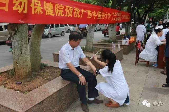 2016年7月14日至7月16日,针灸推拿学院联合人文社科学院赴罗城县、大化县开展暑期社会实践义诊与健康调查活动。针推学院潘立老师、人文学院宋南老师和渠淑洁老师参加了此次活动。7月15日上午,实践团队在人文社科学院韦院长的带领下,并得到罗城县妇幼保健院的支持与帮忙在罗城大广场开展义诊和健康调查活动。针推学院主要负责义诊活动,分为艾灸组、手法按摩组、量血压组,各组安排好组员进行有针对性的治疗活动,各位同学都运用在校所学知识与经验给前来参加义诊活动的当地群众做实际的服务;人文学院主要负责对前来参加义诊的群众进行健康知识的调查,两个学院相互配合共同合作,吸引了很多的群众前来咨询与体验。此次义诊还向群众宣传了“三高”疾病的一些相关知识,给予群众了解其危害和预防措施。