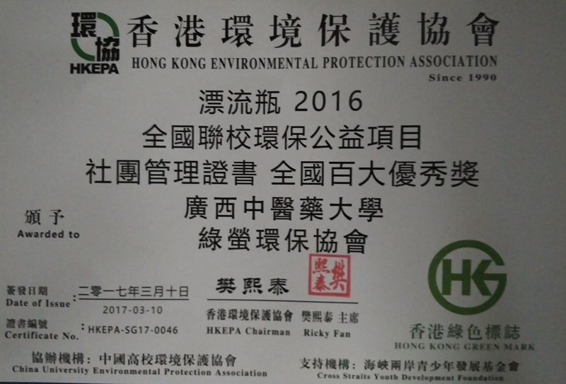 2017年3月14日,YABO鸭脖绿萤环保协会在“漂流瓶”活动中荣获了“全国百大优秀奖”,在“水果贺卡”活动中荣获了“全国十大优秀奖”,这两个活动都是香港环境保护协会主办的全国公益类项目,通过公益项目来推广环保理念,努力让更多的高校学生加入保护环境的队伍之中。