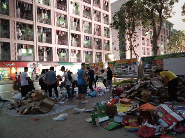 下午5点,志愿者们在五合食堂门口集合签到,有条不紊地准备好所需物品。接着,志愿者们分成几个队伍,拿着麻袋向各个宿舍出发。志愿者们轻轻地敲开每一扇门,礼貌的询问宿舍成员是否有废品需要回收,遇到没有人在的宿舍,志愿者们贴心地贴上便利贴提醒宿舍成员已经进行回收。夜幕降临,志愿者们忙碌的身影还在校园中穿梭。一部分志愿者把废品拿到场地,进行废品分类。志愿者们不怕苦,不怕累,一直坚持到活动最后一刻。最后,活动以志愿者们一张温馨的大合照结束。这是一个爱的开始,绿色回收的启航。