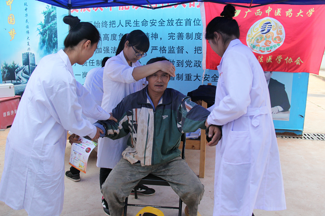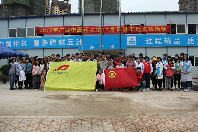 2017年11月19日上午,由鸭脖团委、校学生会、大学生社团联合会的部分成员及大学生手法医学协会、青年同伴教育中心、大学生红十字会的部分成员组成的爱心团队一行65人进入邕宁区香醍半岛威宁·邻家龙岗东广场的工地开展以“践行医道精神,让爱与健康同行”为主题的义诊活动,号召工人们关心自己的身体健康,并向工人们展示中医药文化独特的风采。
