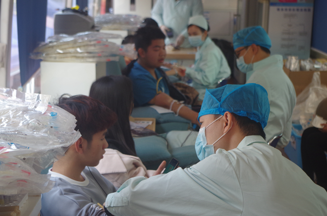 清晨的暖阳撒下徐徐温暖,暖沐人心。上午10时,无偿献血正式开始,同学们格外热心,积极参与,陆陆续续赶来排队,在志愿者引导下,开始逐项进行填表,体检,验血等项目,在血车旁耐心地等候献血。血车上,都是献血者的身影。另一边,志愿者们为献血者答疑解惑,为医生护士传递器材,服务每个来访者。