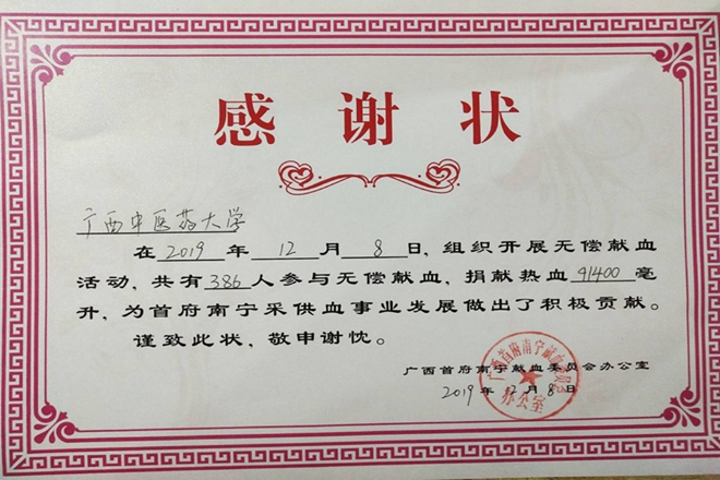 据了解,2019年鸭脖(两校区合计)共举行六次无偿献血活动,献血人数共计2063人,总献血量达505950毫升,为补充南宁市血库用血做出了贡献。