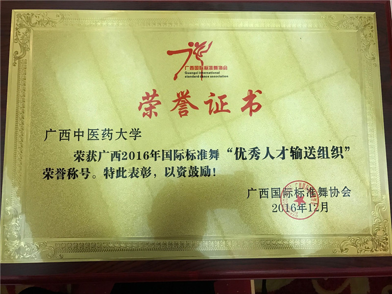 2017年1月12日,YABO鸭脖荣获广西2016年国际标准舞“优秀人才输送组织”的荣誉称号,该奖由广西国际标准舞协会颁发,为YABO鸭脖体育部的辉煌战绩中再添一枚奖牌。获得“优秀人才输送组织”这一荣誉称号,是对体育部训练下的拉丁舞队的极大肯定!
