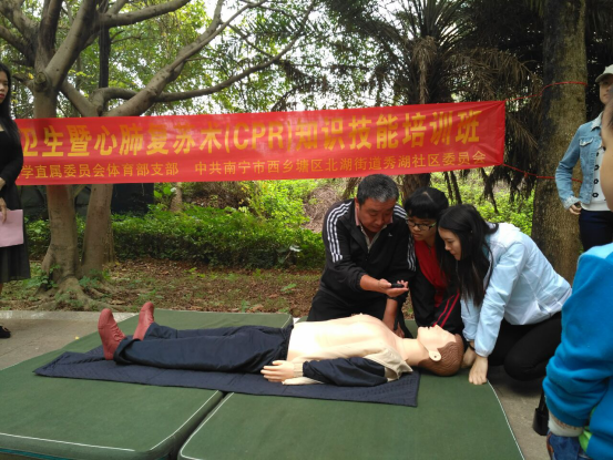 心肺复苏(CPR)是鸭脖公体教学“传统保健体育养生”专选课程的项目内容之一。2017年4月23日上午,结合原已开展的社会慈善义工活动。该项目教学实训活动在南宁市仙葫开发区的海茵社区展开,30多位同学在兰兰老师的指导下认真习练,在完成教学计划任务的同时,向社会群众宣传推广CPR知识技能,努力提升全民临场急救意识,是此项活动的主旨。活动将持续至5月下旬,每逢周六、日上午,在学生开展“ 三义”慈善活动的同时,均会开展CPR实训活动。项目活动得到了海茵社区管委会的大力支持,谨于此表示诚挚谢意。