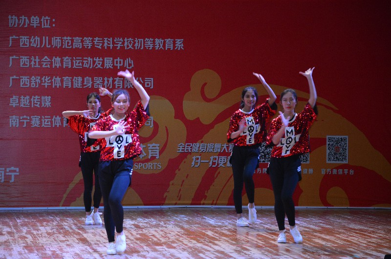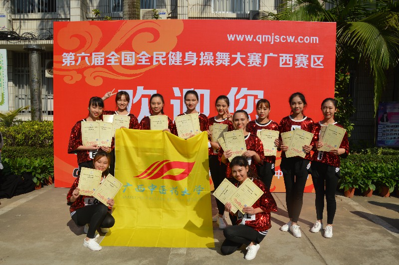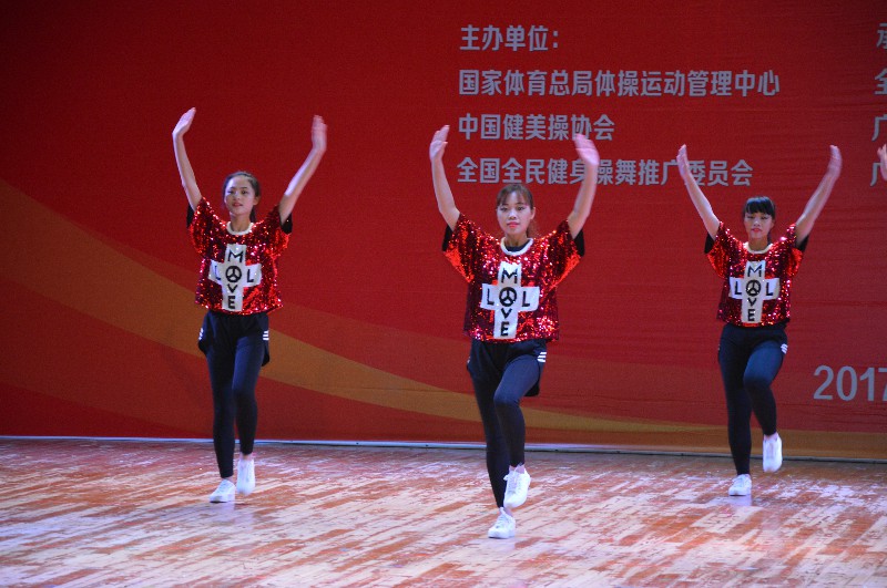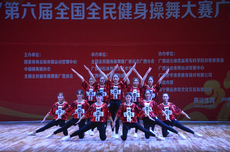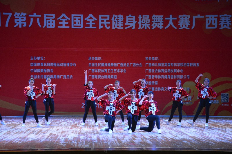 “2017第六届全国全民健身操舞大赛广西赛区”于2017年12月16-17日在广西南宁隆重举行。本次大赛由国家体育总局体操运动管理中心、中国健美操协会、全国全民健身操舞推广委员会主办,全国全民健身舞推广委员会广西分会承办,比赛历时两天,共有88个参赛单位2500余人次参赛。鸭脖体育部主任李荣源为领队,唐莹老师为主教练,王佳佳、曾雨涵等11位选手参加本次比赛。