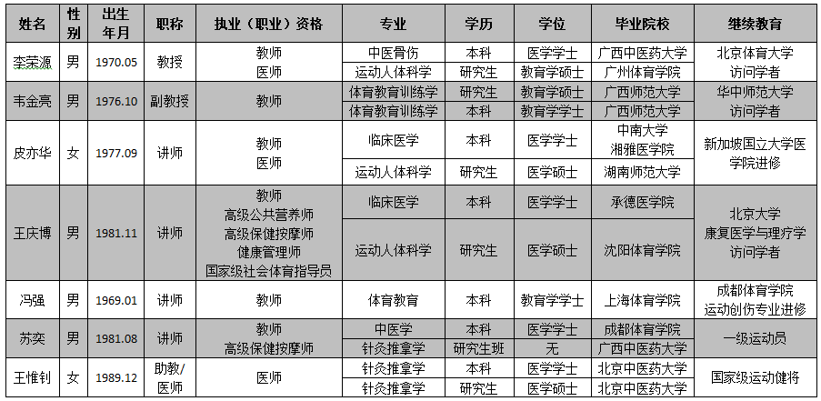 运动康复专业教学团队基本情况一览表