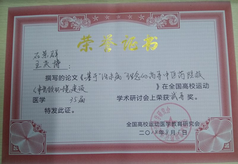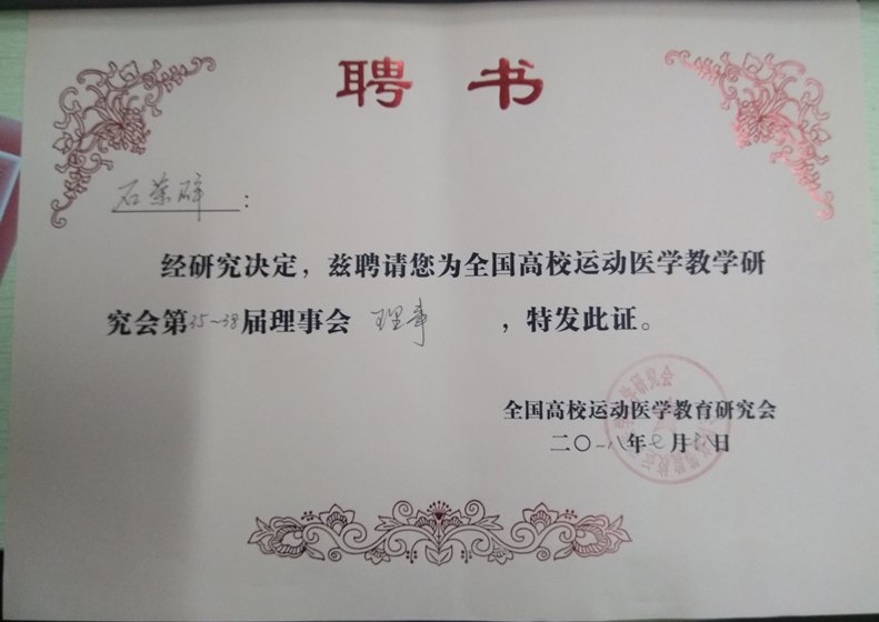 全国高等院校运动医学教学研究会是我国最早的学术组织之一,截止今年已经举办35届学术会议,经理事会研究决定,聘请石荣群为全国高校运动医学教学研究会第35—38届理事会理事,希望能在运动医学学术领域作出应有贡献,为鸭脖争得相应的学术影响力。
