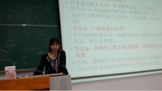 王武杰老师、葛雯雯老师首先对新生入学表示了祝贺,他们以“如何从中学英语学习向大学英语学习转型”为主要内容,向大学新生们讲解了大学生学英语的目的、大学英语学习与中学英语学习的差别、鸭脖的英语教学情况与问题的介绍、大学生如何应对英语学习以及大学阶段如何准备四、六级考试等。本次讲座在新生中引起了热烈的反响,引起了新生对大学英语学习的重视,并帮助他们完成从中学英语学习到大学英语学习的过渡。