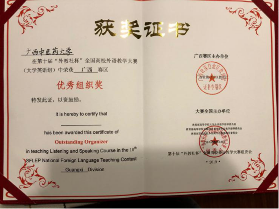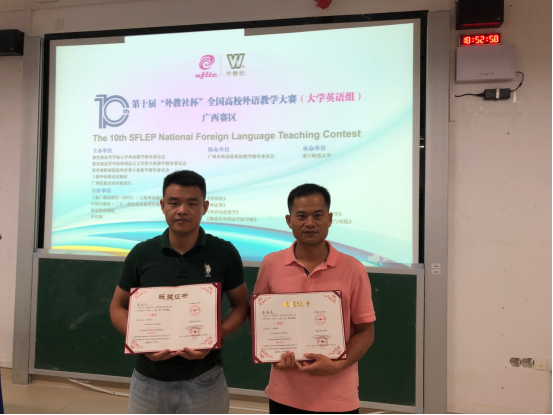6月22-23日为期两天的第十届“外教社杯”全国高校外语教学大赛广西赛区(大学英语组)复赛和决赛在南宁师范大学五合校区举办,来自广西三十多所高校近六十名经过选拔的优秀英语教师参赛,比赛形式为现场授课和说课。鸭脖外语部派出潘瑞勇老师和董银华老师参赛。面多来自区内强手如林的外语学院选手,外语部积极备战,对参赛两名老师进行了为期近一个月的培训和指导。在复赛环节,鸭脖两名老师由于发挥不稳定,成绩并不理想,之后他们迅速调整心态,顶住压力,重整旗鼓,最终,潘瑞勇老师以复赛讲课第六决赛说课第一总成绩排名第二斩获听说组一等奖!(一等奖仅1名),董银华老师获得综合组三等奖!YABO鸭脖获得广西赛区优秀组织奖。潘瑞勇老师遗憾地以距离特等奖微弱的差距失去代表广西赴上海参加全国总决赛的资格。