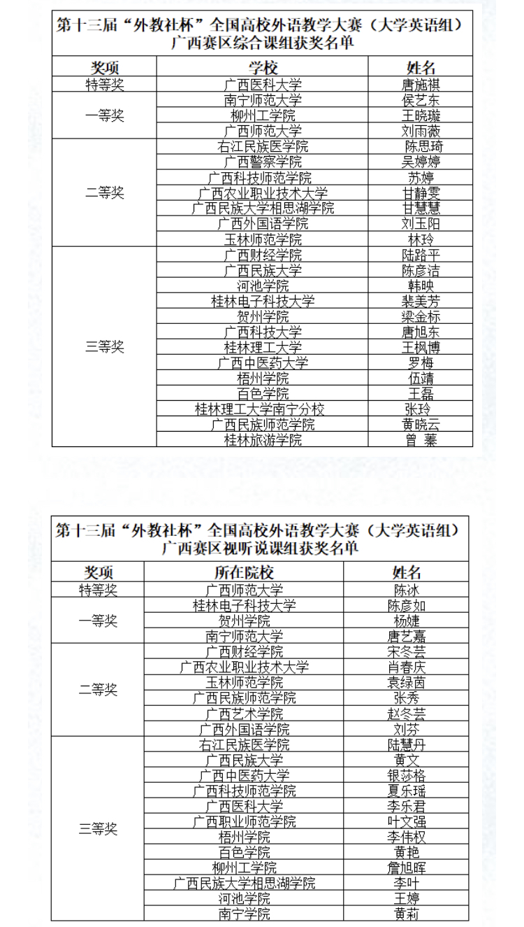 近日,第十三届“外教社杯”全国高校外语教学大赛(大学英语组)广西赛区比赛圆满落幕,外语部罗梅老师和银莎格老师分别获得大学英语综合课组、大学英语视听说课组三等奖。