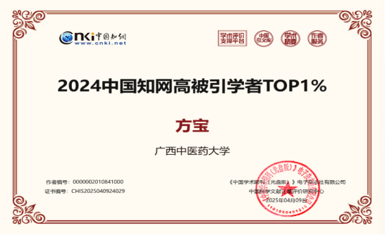 据悉,此次评选是中国知网中国科学文献计量评价研究中心,基于中国知网收录的近10年(2014-2023)国内学术期刊论文,对每位学者的论文引证标准化指数进行计算,首次开展学者学术影响力客观评价,遴选了“2024中国知网高被引学者”名单。2024 中国知网高被引学者TOP1%需满足:近十年发文的作者总PCSI (Paper Citation Standardized Index)位于初选作者范围的TOP1%(全国共约335万名学者进入初选,共有3万学者入选TOP1%,基线值为31.016);且近十年发表PCSI高于理论平均值(1.65)的论文不少于5篇以及近十年至少发表1篇学术精要高影响力论文。近十年来,方宝教授累计发表了3篇高PCSI论文和高被引论文,同时还获得了5项广西社会科学优秀成果奖二等奖/三等奖(均为第一作者)。