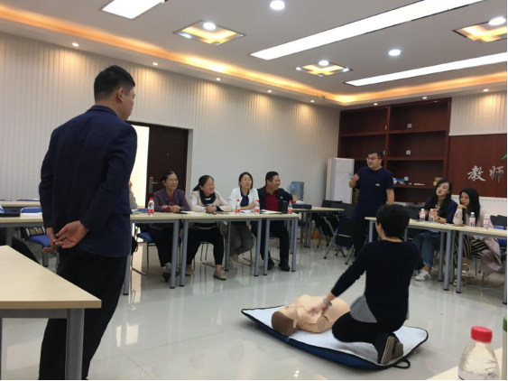 接着仙葫院区第一党支部李兵、熊世磊两位同志向外语部党员老师们进行了心肺复苏CPR急救技能培训,包括胸外心脏按压术的介绍、注意事项及现场教学。外语部老师们积极学习心肺复苏急救技术,他们纷纷表示希望能再学习更多的急救知识。