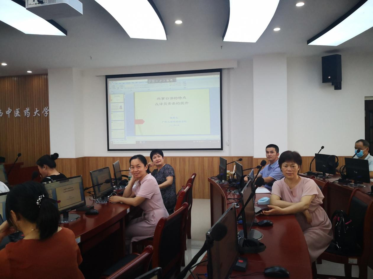 盛夏临近,生机勃勃的校园里学习氛围热烈高涨。为了提升广大师生对外交流和传播中医的能力,6月14日上午,外语部邀请了广西大学外国语学院副院长陈碧兰博士来鸭脖进行了主题为“外事外交口译的特征及译员素养的提升”的讲座。大学英语教研室(二)的老师全部参加了此次讲座。