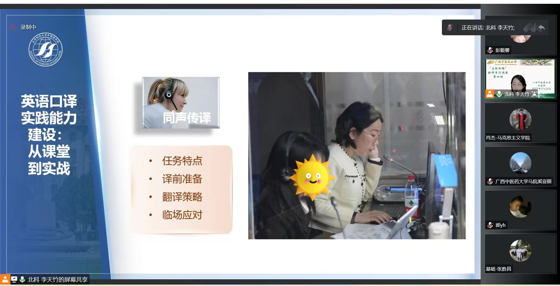 2022年11月24日下午,CATTI一级口译员、北京科技大学的李天竹老师受邀为外语部举行“杏林译路”翻译系列讲座第四讲。鸭脖MTI导师、课程教师和翻译硕士研究生在仙葫校区自诚楼A703口笔译实训室现场聆听,线上腾讯会议150余名师生参与该讲座。讲座由MTI教育中心主任陈滢竹博士主持。