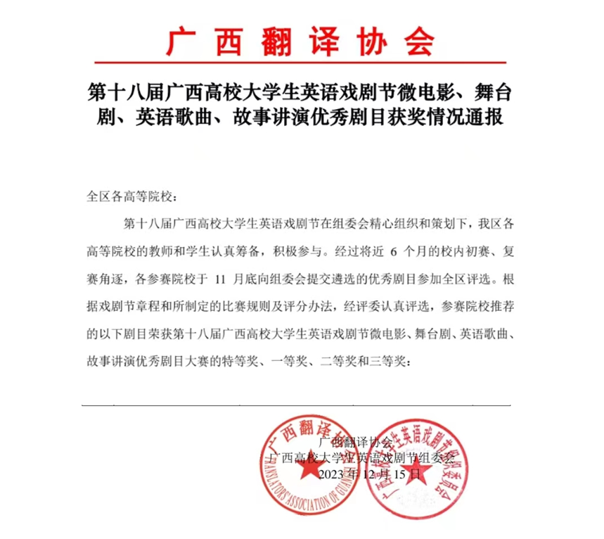 鸭脖学生参加第十八届广西高校大学生英语戏剧节喜获佳绩