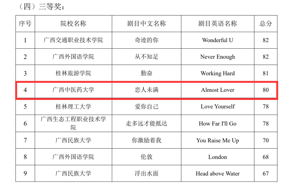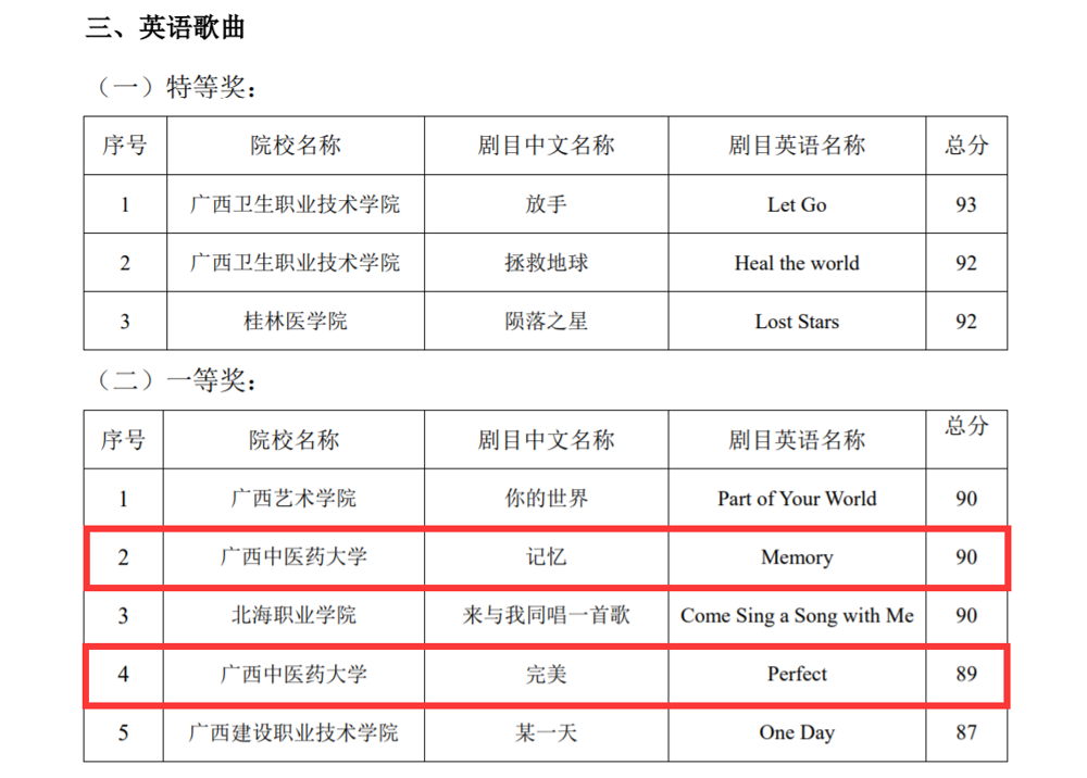 近日,第十八届广西高校大学生英语戏剧节英语歌曲比赛落下帷幕,鸭脖2023级壮医学刘承的歌曲《Perfect》和2023级中医学农玺樾的《Memory》获得一等奖,2022级临床医学吉克阿秀的《Almost Lover》获得三等奖。
