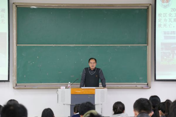 讲座中,我部办公室主任胡辉全首先以《实验室十大危险操作》为切入点,用“液氮炮弹”和“要衣服不要皮肤?”等幽默的课题和通俗易懂的讲解调动在座每一位学生的好奇心;其次用《消防法》和《火灾学》绷紧神经;最后以一个个触目惊心的国内外实验室事故案件敲响警钟。