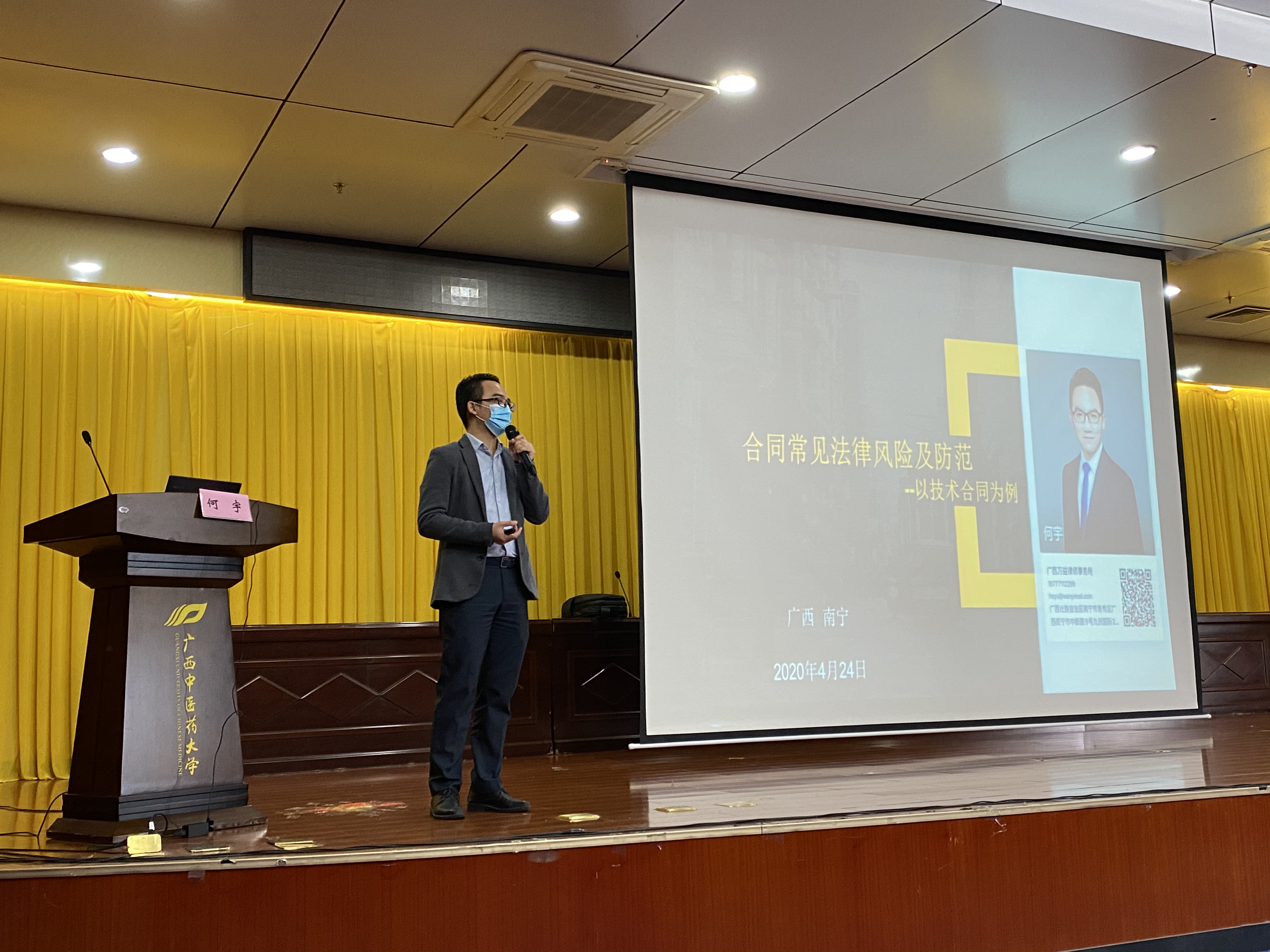 为响应国家法治主张,增强学校教职工法治观念,强化学法用法意识,提高学校管理人员依法管理能力和依法办事能力。2020年4月24日上午,学校校长办公室邀请广西万益律师事务所合伙人何宇律师到鸭脖讲授法律知识。讲座由校长办公室副主任张璐砾主持。学校各部门涉及法律合同业务的人员参加了此次讲座。
