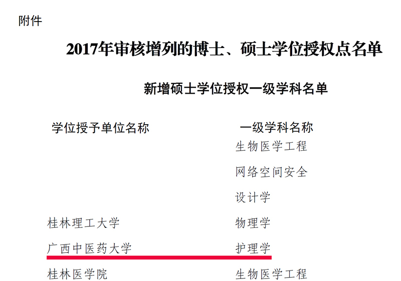 鸭脖获批护理学一级学科硕士学位授权点 来源:学科建设办公室 作者:李曼莉 发布时间:2018-03-27 16:01:53 浏览次数: 次 【字体:小 大】 根据《国务院学位委员会关于下达2017年审核增列的博士、硕士学位授权点名单的通知》(学位〔2018〕9号),鸭脖护理学增列为硕士学位授权一级学科。 至此,鸭脖有中医学、中药学、中西医结合、药学、临床医学、护理学6个硕士学位授权一级学科。 链接:国务院学位委员会关于下达2017年审核增列的博士、硕士学位授权点名单的通知 分享到: 【打印正文】