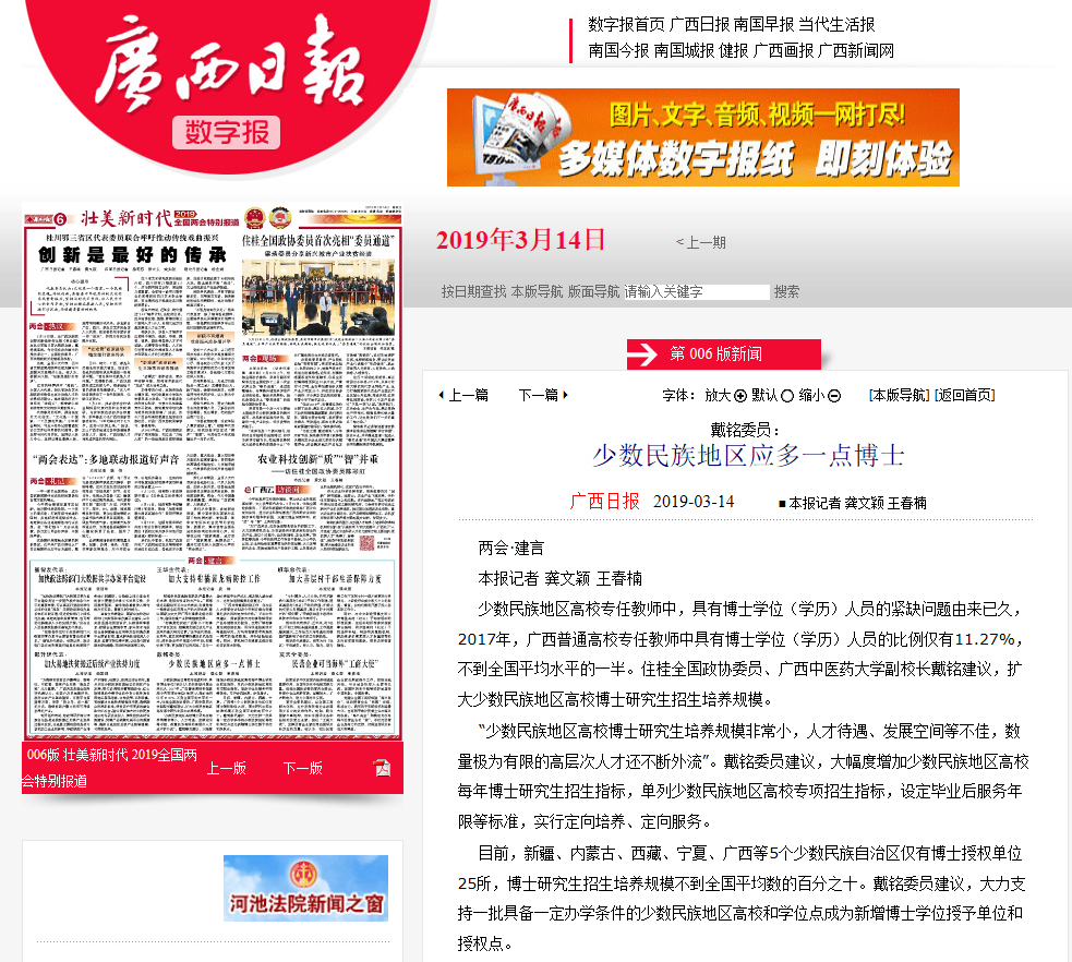 少数民族地区高校专任教师中,具有博士学位(学历)人员的紧缺问题由来已久,2017年,广西普通高校专任教师中具有博士学位(学历)人员的比例仅有11.27%,不到全国平均水平的一半。住桂全国政协委员、YABO鸭脖副校长戴铭建议,扩大少数民族地区高校博士研究生招生培养规模。