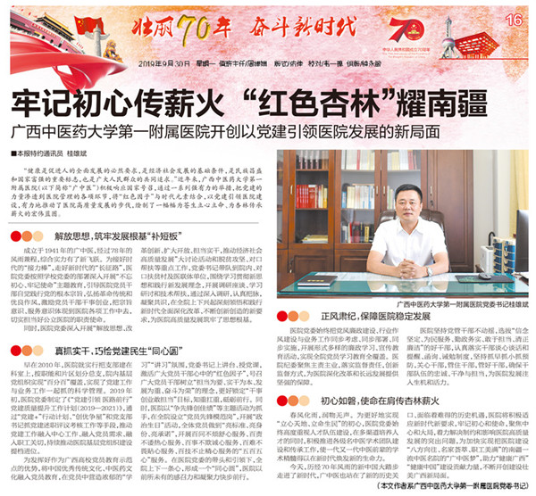 【南宁晚报】医院党委书记桂雄斌在《南宁晚报》发表署名文章——牢记初心传薪火 “红色杏林”耀南疆