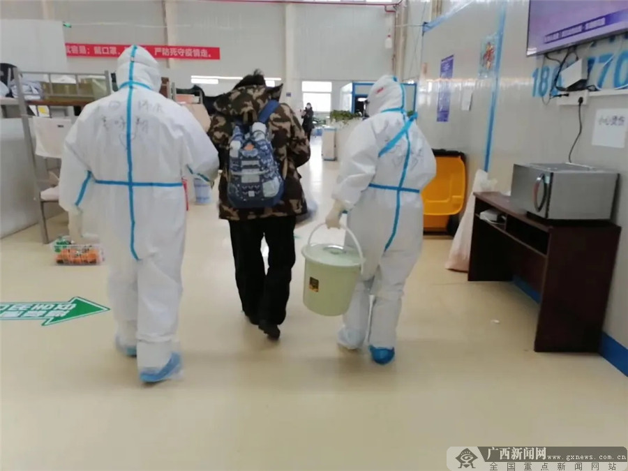 14点左右,接到社区的电话,社区的志愿司机已经到医院门口了,李咏翔帮老大哥提着行李,跟在他身后,一路走向出口。一路上,只要是遇到广西的医护人员,老大哥都真诚地道一声“谢谢”。当大门打开,明媚的阳光照入眼帘,老大哥露出了久违的微笑……