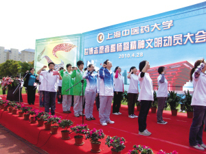 正像该校学生张蕾娟及左嘉吟共同为迎接世博会创作的歌曲《我们都是中医海宝》里唱的: