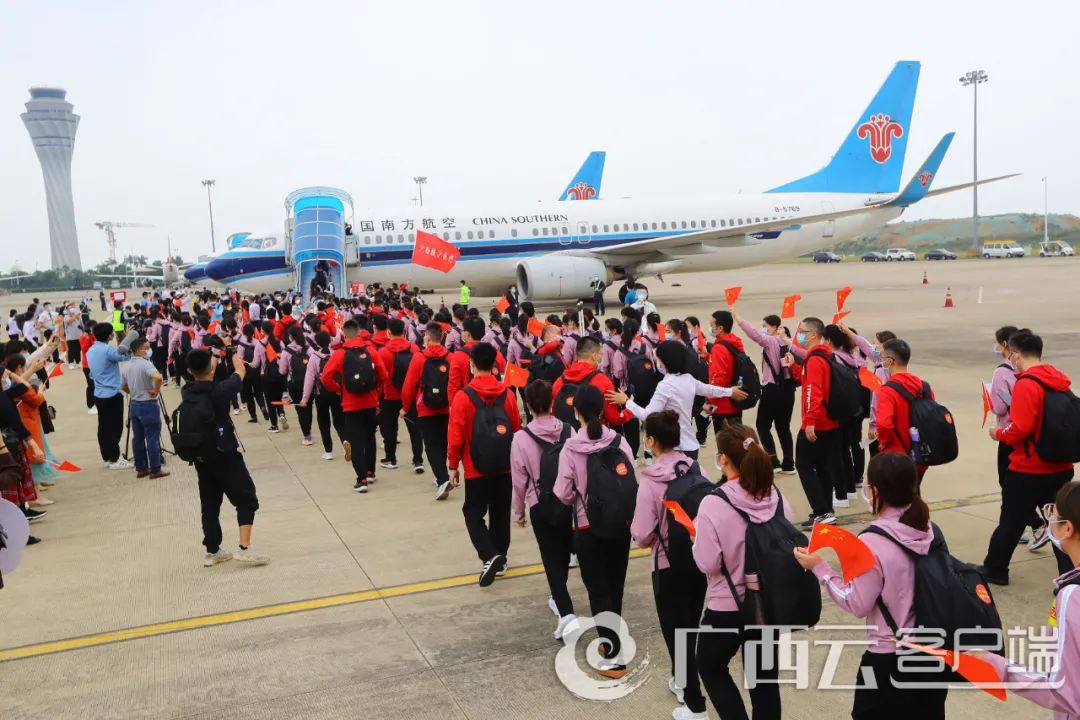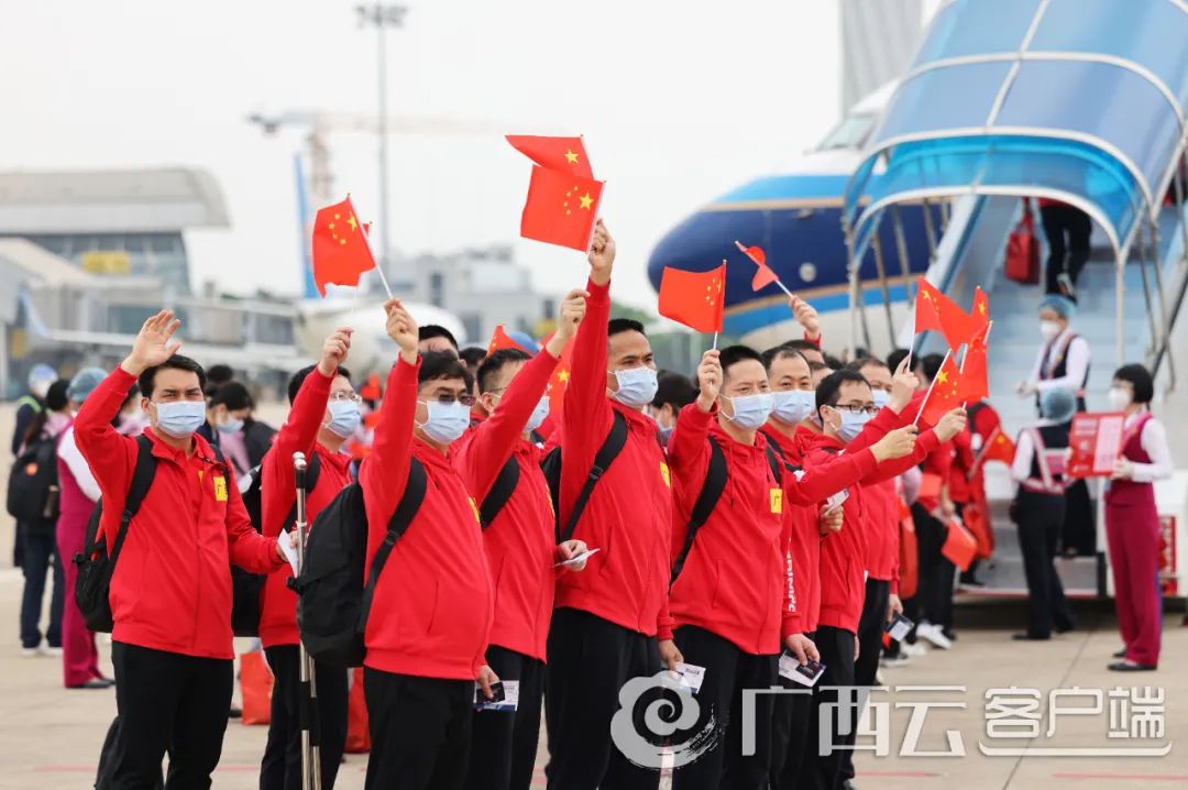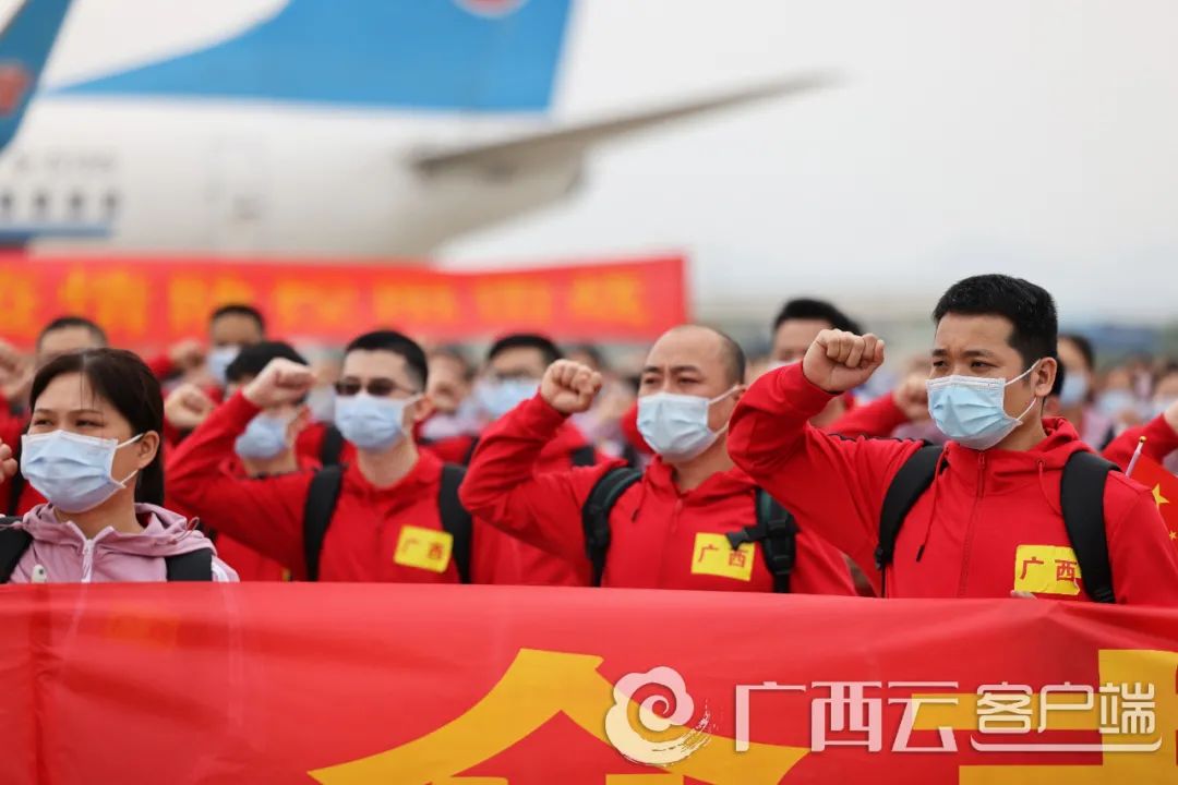 4月15日上午,广西援沪医疗队在南宁吴圩国际机场举行出发仪式,295名医疗队员庄严宣誓后乘包机奔赴上海。