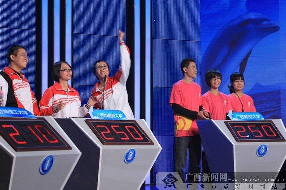 YABO鸭脖代表队抢得最终的答题权,冠军在望乐不可支。广西新闻网记者 邓昶摄