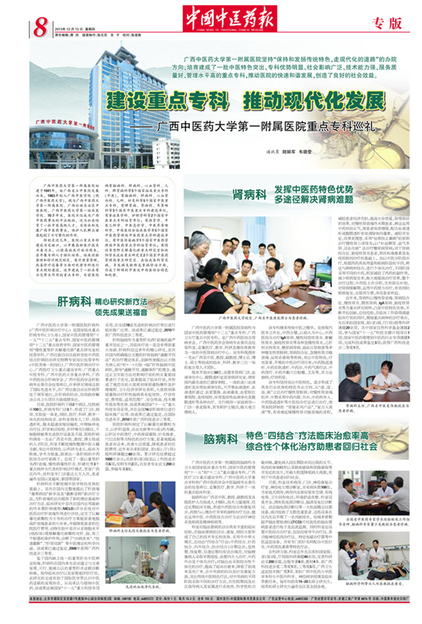 2013年12月12日,《中国中医药报》在其专版整版刊登了题为《建设重点专科 推动现代化发展》的文章,对一附院中医特色突出、专科优势明显、社会影响广泛、技术能力强、服务质量好、管理水平高的重点专科进行了专题报道。