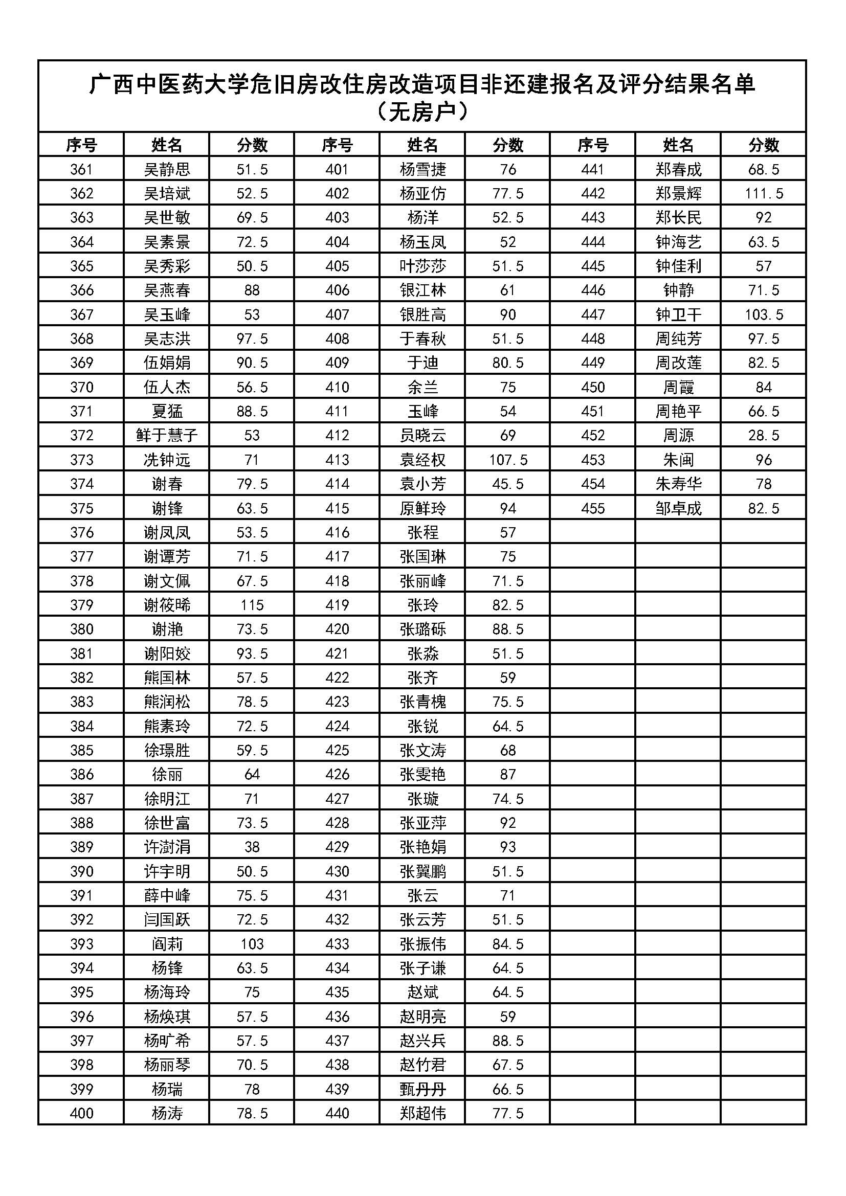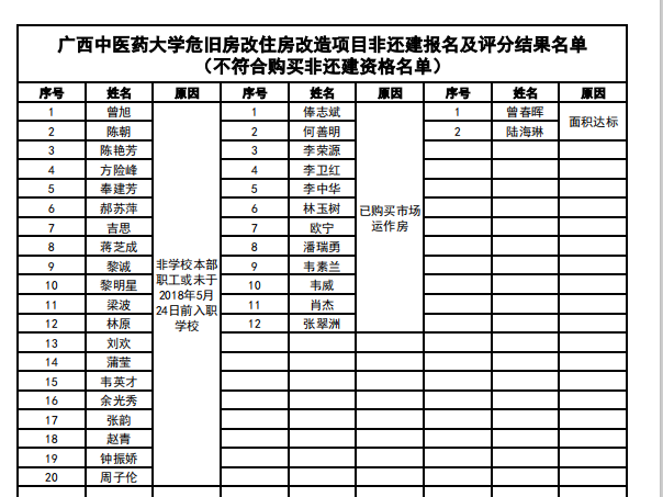 鸭脖明秀校区危旧房改住房改造项目非还建报名工作已完成,全校共计545名职工报名。根据《YABO鸭脖危旧房改住房改造项目非还建住房申购报名工作方案》,购房资格及评分分值已由学校人事处、房产管理部门初步审核完毕,现将结果公布如下: