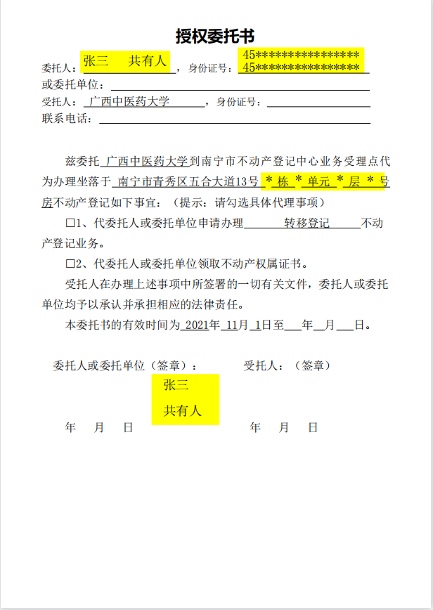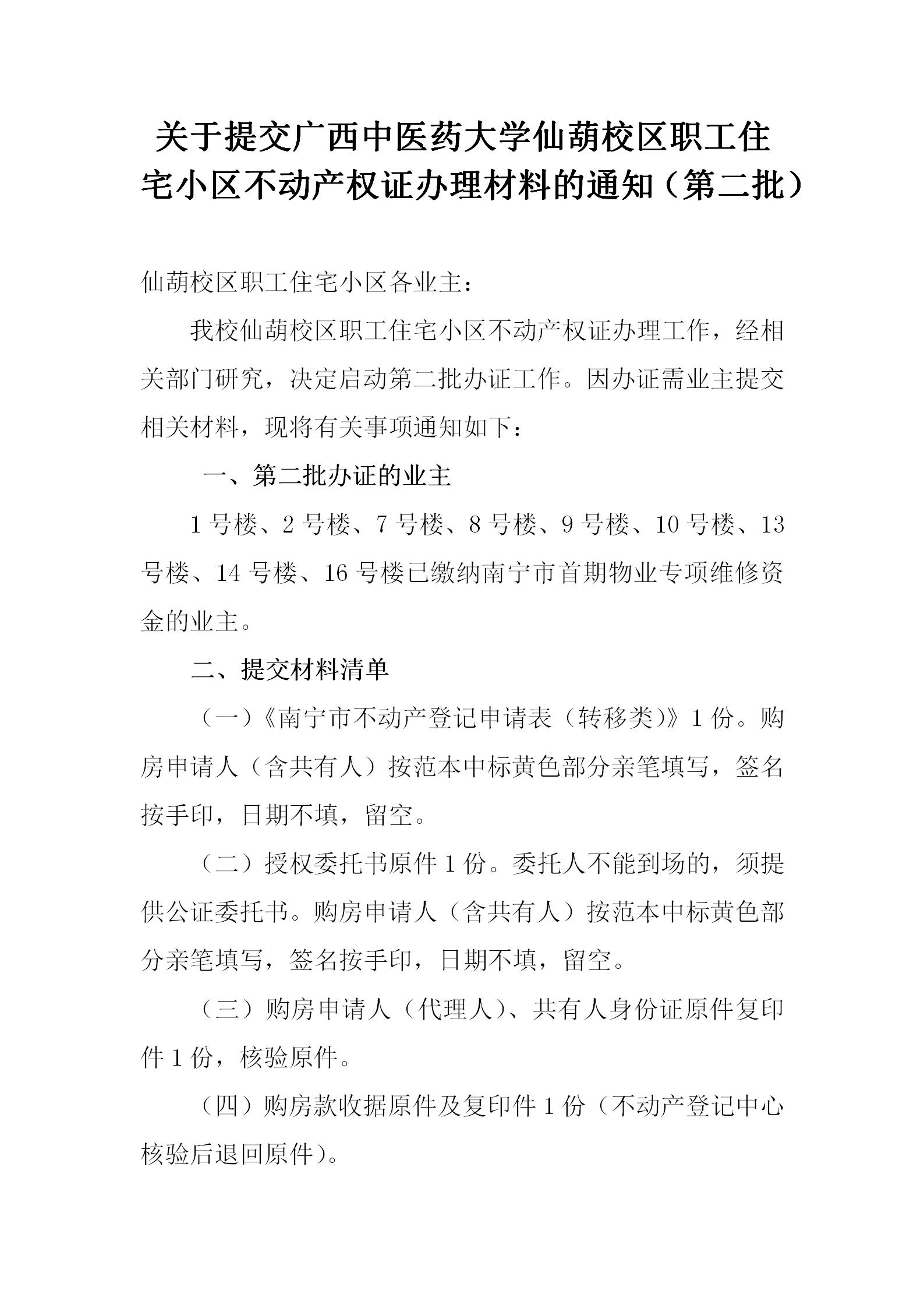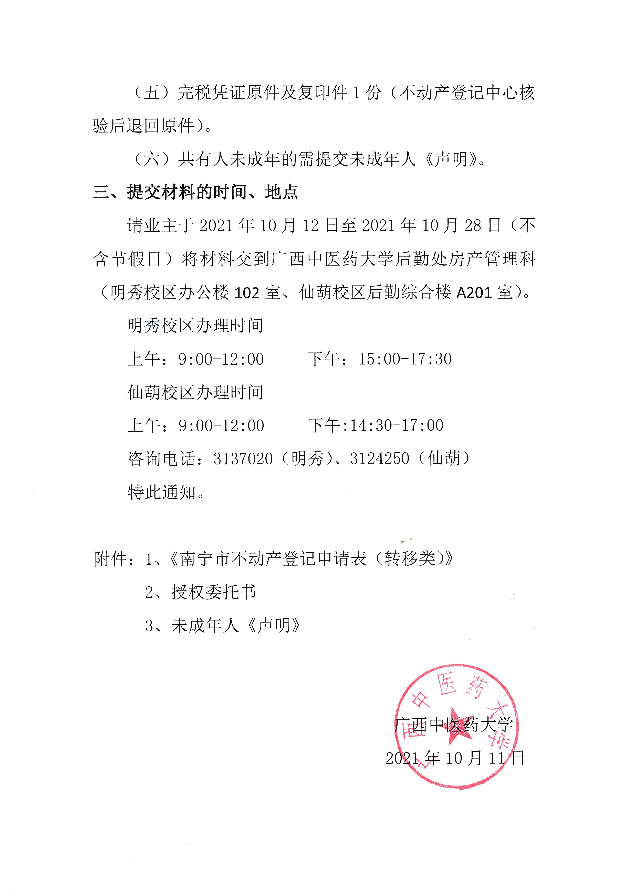关于提交YABO鸭脖仙葫校区职工住宅小区不动产权证办理材料的通知(第二批) 日期:2021-10-12 点击数: 次 分享到: 附件1.南宁市不动产登记申请表(转移类)空白表.pdf附件2.授权委托书.docx附件3.未成年人(声明).docx 打印正文 关闭本页