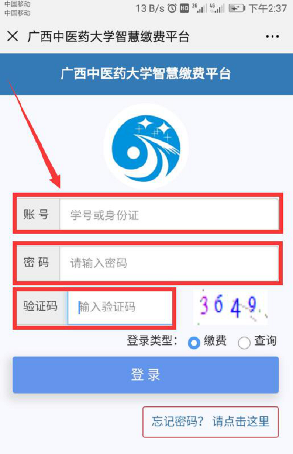 (3)进入“缴费平台”:在“账号”一栏输入“身份证号”;密码为:gxzyydx+身份证后六位(如王某某身份证号为:45088ABCD09252666,则登录密码为:gxzyydx252666);并输入验证码;点击“登录”即可。