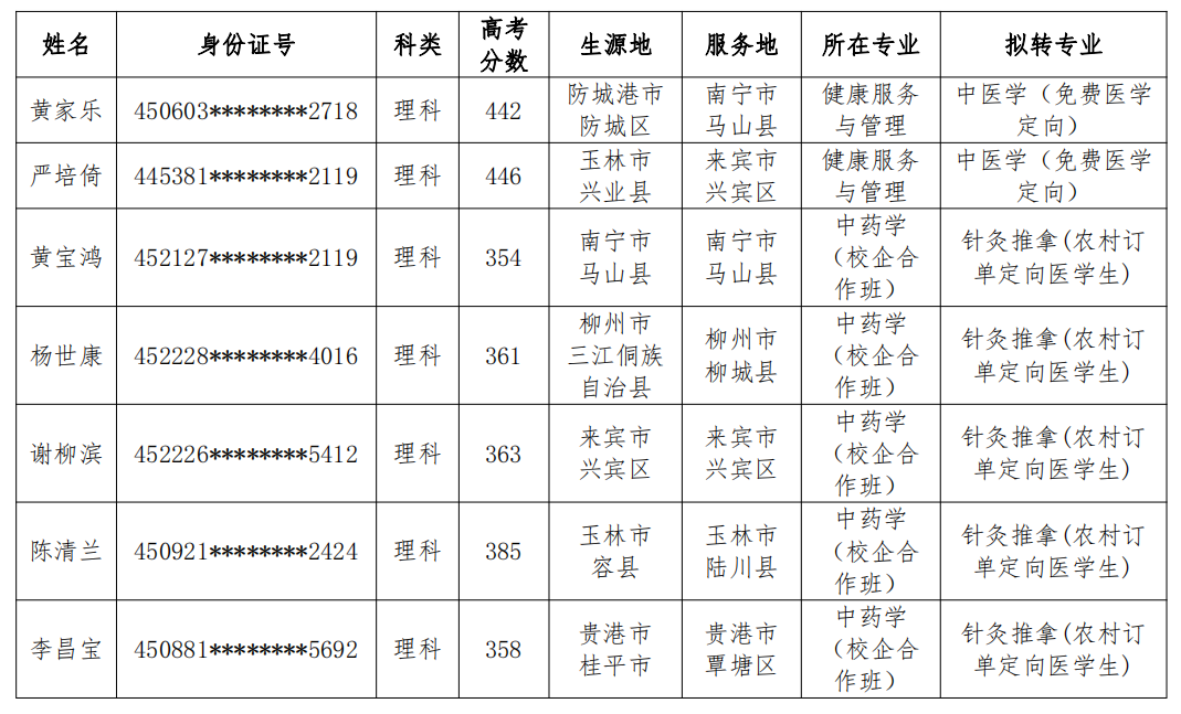 根据自治区卫健委、教育厅、中医药局联合下发的《关于全面落实2021年农村订单定向医学生免费培养招录任务的通知》以及鸭脖《关于全面完成2021年农村订单定向医学生免费培养招生任务的通知》等文件精神,结合学生报名情况,拟将2021级黄家乐等2名同学的录取专业调剂为本科中医学(免费医学定向)专业,拟将杨世康等5名同学的录取专业调剂为高职针灸推拿(农村订单定向医学生)专业,现将名单公示如下: