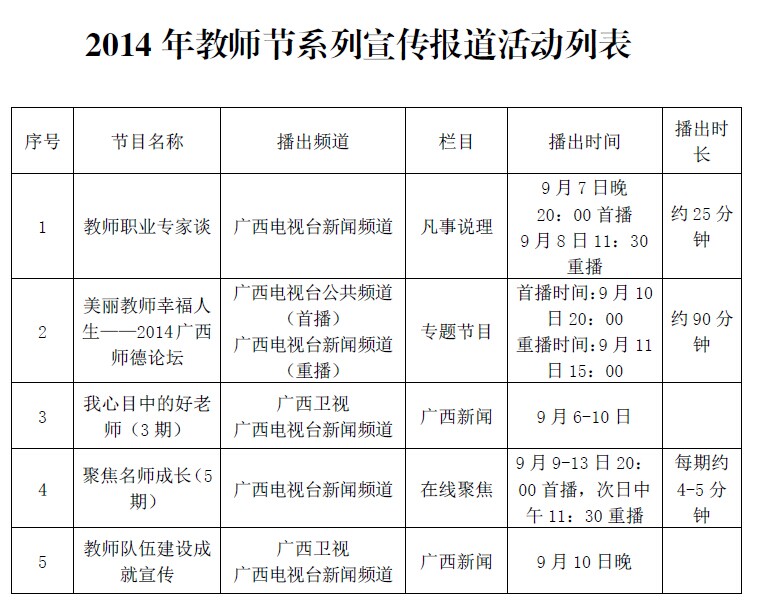 为庆祝第30个教师节,广西教育厅与广西各有关媒体合作组织开展了系列教师节宣传报道活动,请学校各部门、单位组织广大师生观看近期广西电视台有关节目,节目详细列表如下: