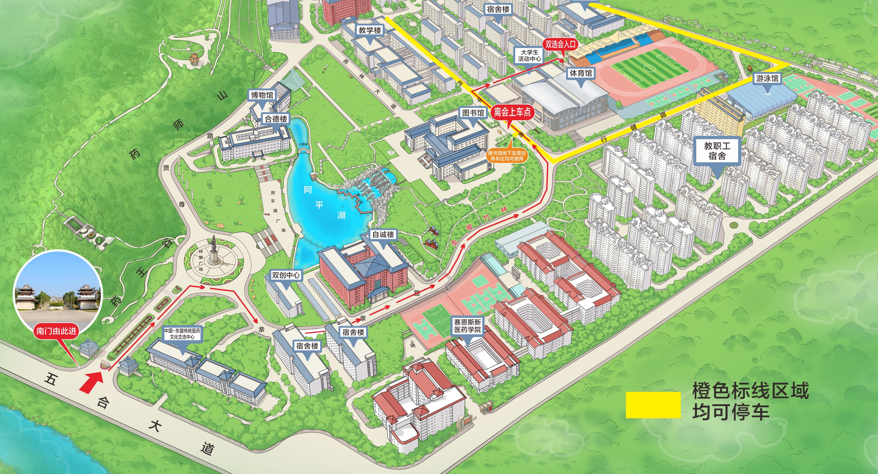 6.学校将安排交通车分别于13:00、13:30、14:00、15:00,在图书馆侧面公交车站(任重道远石刻旁)接送参会人员返回协议酒店,有需要的参会人员可自行前往乘车。