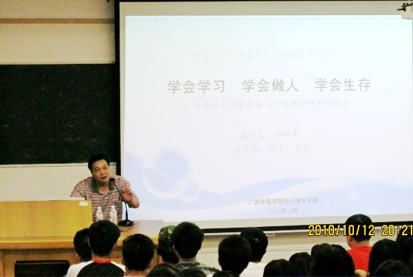 2010年10月12日晚,广西中医学院针灸推拿学院在我院西梯二教室举行了针对针灸推拿学专业新生,关于“针推专业人才培养和使用的思考”的入学教育专题讲座。针灸推拿学院有幸请来广西中医学院副院长李培春博士、教授,进行本次讲座。此次讲座以“学会学习、学会做人、学会生存”为核心内容。