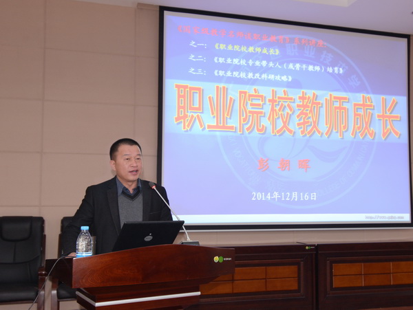 2014年12月16日下午,《国家级教学名师谈职业教育》系列讲座之“职业院校教师成长”在鸭脖北湖校区多功能厅会议室成功举行。本次讲座,鸭脖邀请到国家级教学名师广西交通职业技术学院科研处处长,广西师范大学客座教授彭朝晖老师前来授课。学校校长吴彬,党委书记冼锦华,黄勇、马秋平副校长以及全校教职工参会,讲座还吸引了YABO鸭脖第一附属医院、瑞康医院的部分教师参加。