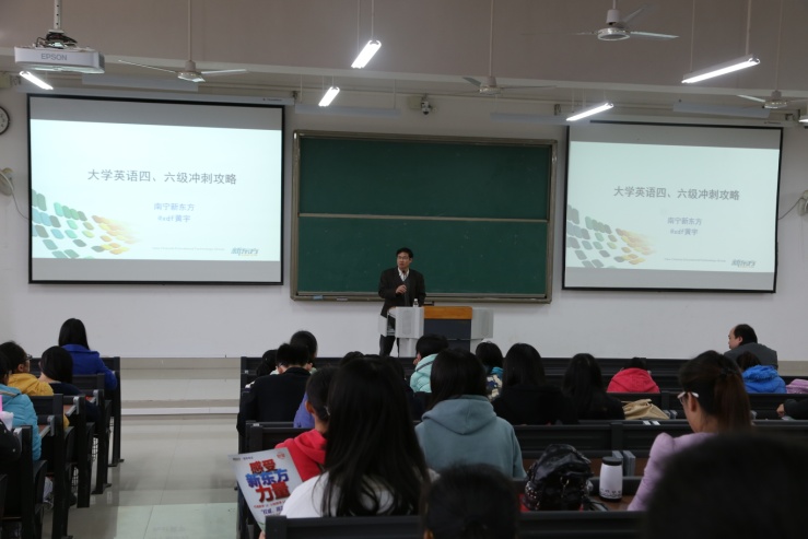 为了帮助同学们熟悉《新东方多媒体学习库》的使用方法,获得更广阔的信息源,全面了解英语四、六级资讯,熟练掌握英语四、六级考试技巧,提高英语四、六级考试通过率,11月29日,图书馆特邀请南宁新东方学校黄宇校长到鸭脖仙葫校区1-101、明秀校区西梯二教室分别进行了讲座。蒋才武馆长主持此次讲座,400余名学生听取了讲座。